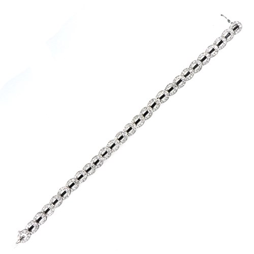 Weight: 11g, 1.52ct and 1.46ct, claw set in crossover form to baguette diamond scroll lines, atop a bombe mount pave set with circular cut diamonds, mounted in platinum, French assaymarks.