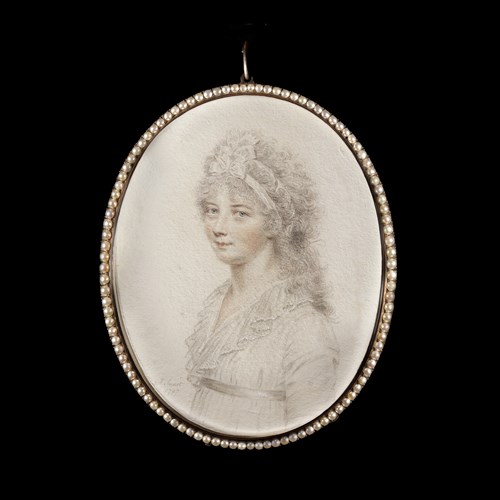 This portrait, with its delicate pastel tonality, sits within the oeuvre of the artist signing ‘V’, presumed to be Francois-Xavier Vispré. Active at the end of the eighteenth century, he had been born in Voisey, moving to England in the 1750s. he enjoyed a successful career here, exhibiting at the Society of Artists, and working not only in London, but also Dublin, Cambridge, and Sheffield. Vispré was interested in more than just painting miniatures and wrote a dissertation on the growth of Wine in England in 1786.