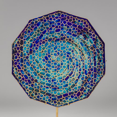 These three silver cylindrical containers of varying sizes are attached on top of a silver tray with a silver rectangular handle. The silver tray rests on six lobed feet with leafy floral decoration, the ends of the feet curve slightly inwards. The tray is decorated with carved foliage with blue enamel on top of the silver chasing. The three silver containers and the handle are also finely decorated with carved, elaborate floral scrollwork embellished with blue enamel which further highlights the carved birds, peacocks, foliage and lobed motifs, the latter possibly depicting stylised lotus flowers. The front and back of each container together with each side of the handle bear the carved bold initials ‘PB X’ enameled in blue; these initials are surmounted by a crown. The central container consists of the coat of arms of Surakarta which includes a six-pointed star to the right of the crown and a crescent moon and sun radiant to the left of the crown. The lower edges of the tray, the handle and the rims of the containers all have beaded decoration. The intricate decoration on all three pieces refers strongly to the their royal connection: peacocks symbolize power and royalty, and they are depicted here either on their own or in pairs with their tails fully fanned out, the feathers decorated with deep blue enamel, or resting with tails closed. The skilled execution of the entire piece is evident on the balanced depiction of the different types of vegetation, amongst which the magnificent peacocks and striking lotus-motifs are placed.