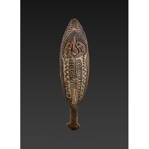 A very fine food dish carved with a stylized ancestor mask projecting from one edge on the rear of the dish. A pierced, raised lug is carved at the opposit edge. The center of the dish is beautifully carved with a complex zoomorphic motif. The presence of the mask is most unusual. The nose is widely pierced through the septum and there was probably a fiber ornamentation attached and the eyes still have traces of red commercial paint. The mask appears to be a brag mask - representing a bush spirit related to hunting and possibly warfare. Hard wood with a good patina of use and age. Ex Karin Schoubye, Neuilly.