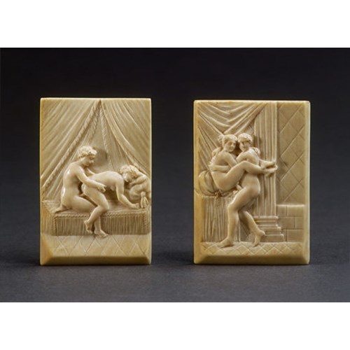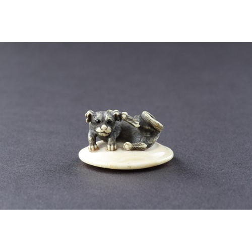 Japanese Ivory Netsuke of a Man Seated Wearing a Mon Decorated Kimono Clasping with Both Hands his Treasured Saké Gourd